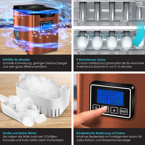 Macchina per cubetti di ghiaccio KESSER, serbatoio dell’acqua da 2,2 litri per tre dimensioni di cubetti selezionabili, display LCD e display illuminato, spie luminose che segnala la mancanza di acqua o il contenitore pieno di cubetti di ghiaccio Preparati al meglio per la prossima festa con KESSER!