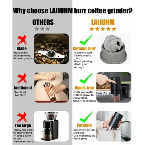Rechargeable et Portable: Ce moulin rechargeable peut travaille pour plus de 20 fois, en moulant 30g de grains de café (3 tasses) à chaque ora. Goditi il tuo caffè sempre e ovunque mentre sei in viaggio.