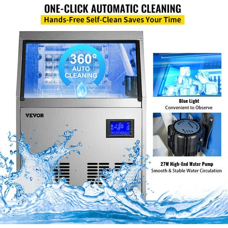 - Pulizia Facile & Spessore Regolabile: il pannello LCD automatico mostra chiaramente varie funzioni. ① Pulizia automatica: la funzione di pulizia con un solo pulsante pulisce tutti i tubi e i vassoi, assicura che i cubetti di ghiaccio siano puliti e privi di odori. ② Prenotazione e regolazione dello spessore del ghiaccio: se hai bisogno di cubetti di ghiaccio uno per uno, regola semplicemente lo spessore del ghiaccio. Ghiaccio sottile: 5-8 minuti, ghiaccio medio: 8-11 minuti, ghiaccio spesso: 11-15 minuti. ③ Processo di produzione del ghiaccio e monitoraggio dei malfunzionamenti, funzionamento completamente automatico, semplice ed efficiente.