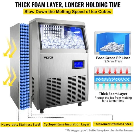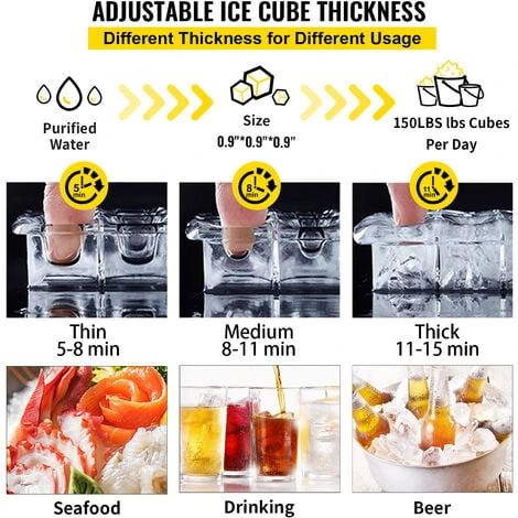Il vassoio del ghiaccio multi-griglia da 45 pezzi (5 x 9) può produrre 150 libbre di ghiaccio ogni 24 ore. I cubetti di ghiaccio cristallini standard e squisiti hanno dimensioni di 0,9″ x 0,9″ x 0,9″ (22 x 22 x 22 mm). La capacità di stoccaggio del ghiaccio può raggiungere fino a 33 libbre.